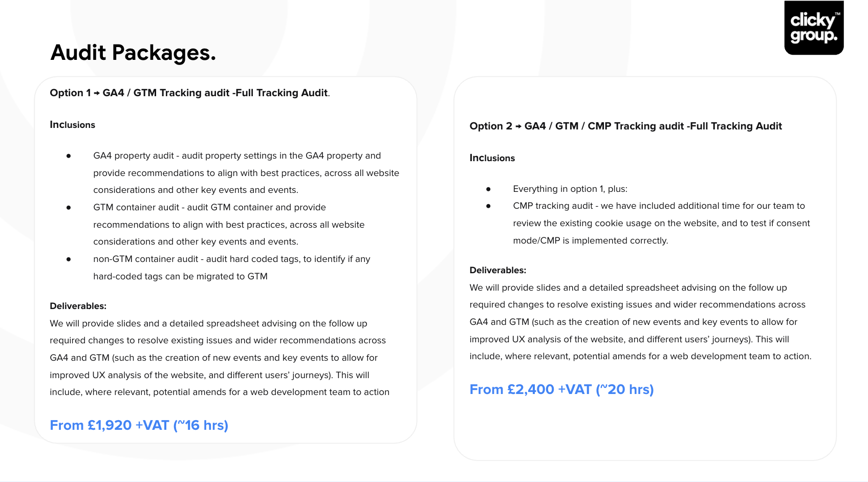 That’s why we recommend a comprehensive GA4 and Google Tag Manager (GTM) health check audit. This ensures your data is accurate and reliable—so every decision you make is backed by insights you can trust.